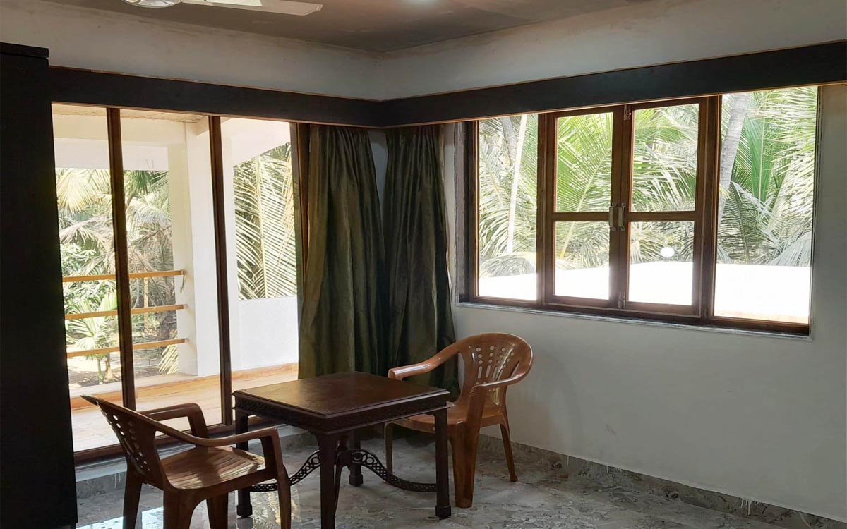 The other three ensuited bedrooms are on the first floor with two terraces facing north east and west respectively where guests can enjoy morning tea while appreciating the peaceful vibe in the area. The cozy terraces will allow you to make the most of balmy evenings and is ideal for hosting an intimate soirée. The room’s King Size hardwood bed with its soft mattress with white bed sheets makes waking up a refreshing experience. The wooden wardrobe comes with plenty of space to hang all your clothing. North facing rooms on upper floor are well appointed, very windy with large teak windows floor to ceiling covered with rich curtains floods the room with natural light and sweeping view of the farm of coconut and supari trees. The rooms are spacious with rich floor tiles and attached dry most hygienic western bath room with granite platform, overhead shower , with premium bath amenities. Hot water to bathrooms supplied through Solar Heater for your comfort.